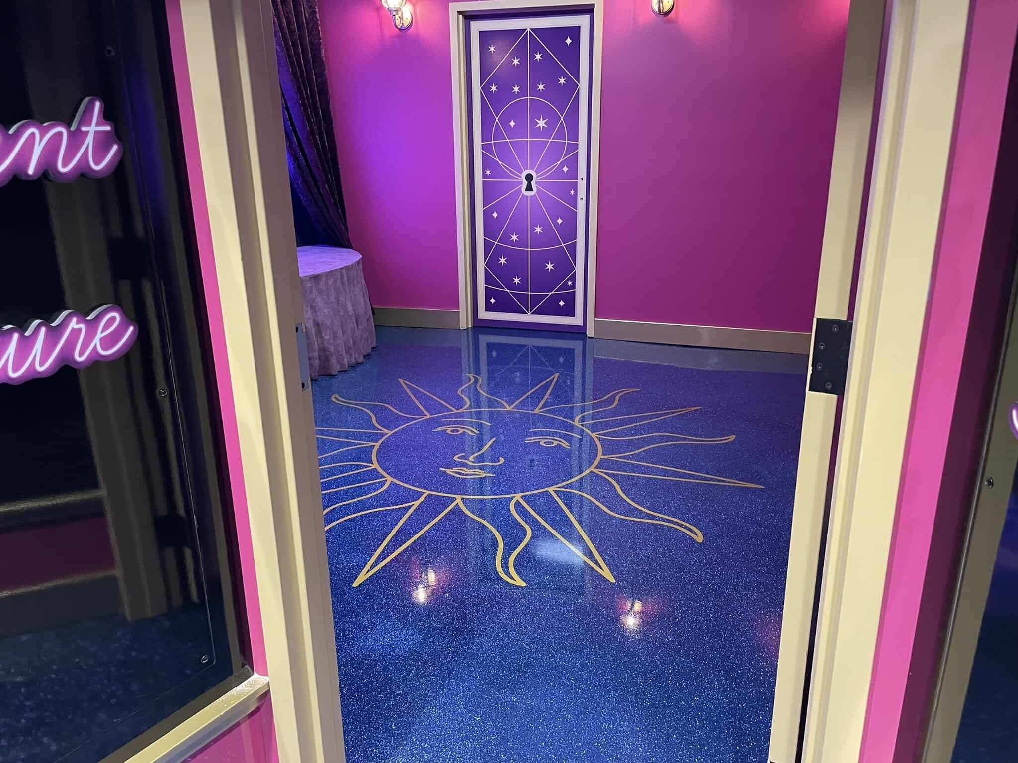 Since no contour cutting is required, this allows for either partial to to full floor to be infused with graphics. This allows us to incorporate the based epoxy into the design including glitter or flake.